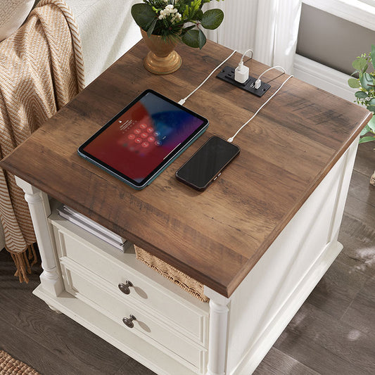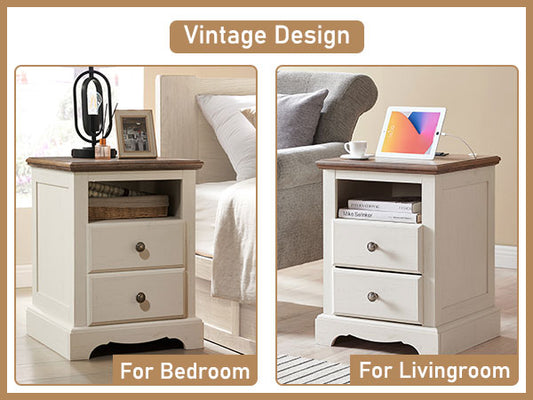 OKD Farmhouse 2 Drawers Nightstand with Charging Station and Open Cubby
