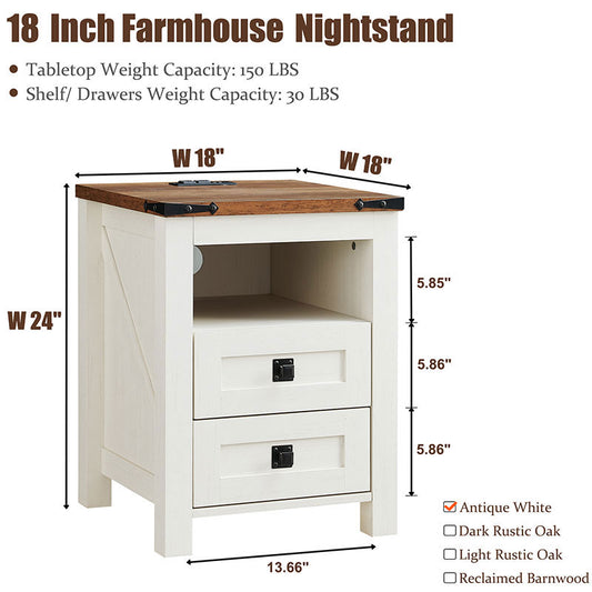 OKD Farmhouse Nightstand with Charging Station, 18 Inch Farmhouse End Table