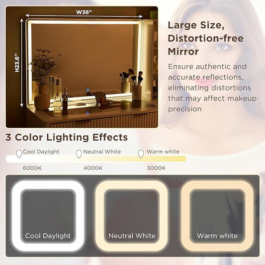 OKD Fluted Makeup Vanity Desk with Large Mirror and Lights, Glass Tabletop