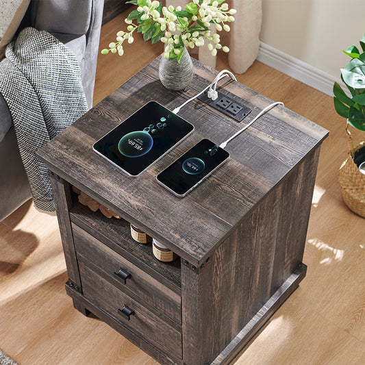 OKD Farmhouse Nightstand with Charging Station, 18 inch Rustic Side table with 2 Storage Drawers
