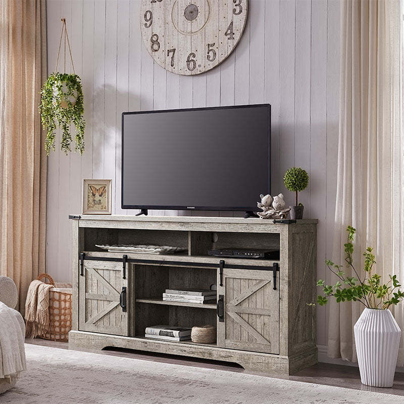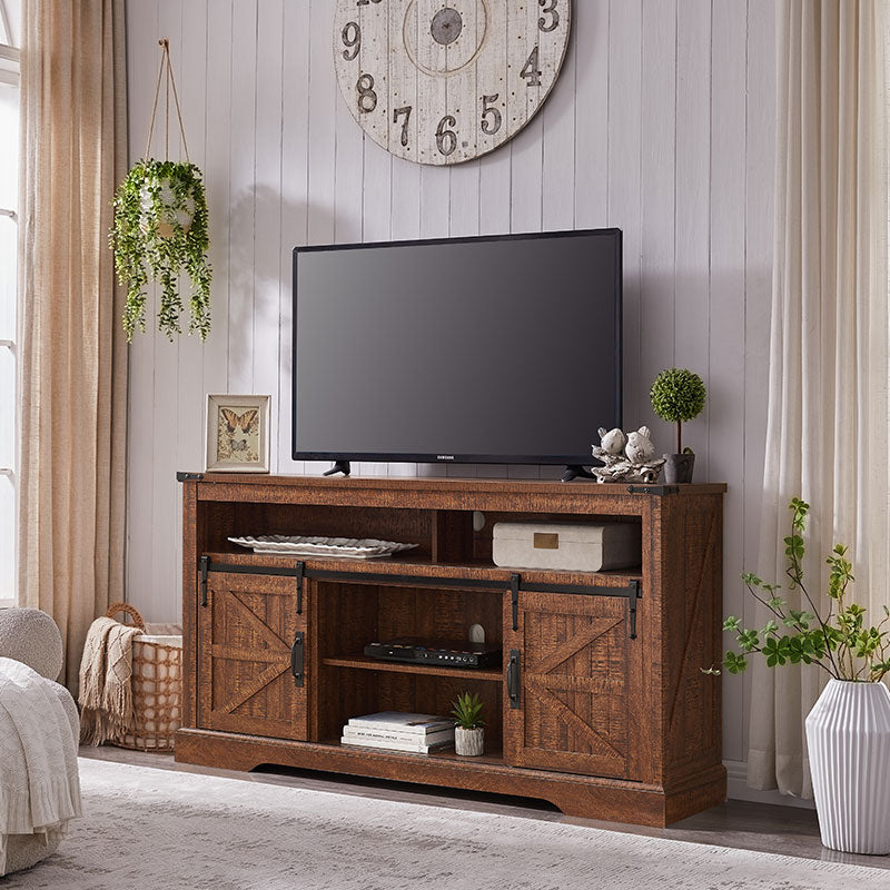 - Ample and Flexible Storage: Classic sliding barn doors add sophistication to the space and allow you to hide clutter behind the doors, keeping the room neat and organized. Each storage cabinet has 1 removable and adjustable storage shelf to fit items of different-sized. 60" wide tabletop fits tv up to 70 inches. Large cable/cord management cutouts to keep electronic wires organized.