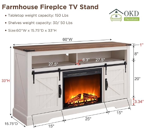 Easy Assembly: Assembly is no longer a trouble! OKD TV stand with fireplace comes with clear step-by-step illustrated instructions, easy to read and follow. All screws and parts are labeled. Your electric fireplace entertainment center will be in a very secure box that contains foam and wood protective boards surrounding it.